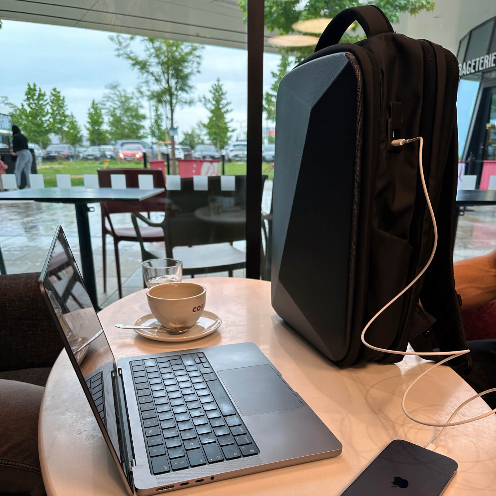Connectez votre propre batterie externe au port USB intégré depuis l'intérieur du sac à dos. Connectez ensuite votre ordinateur portable, tablette ou téléphone portable depuis l'extérieur du port. Vous trouverez le port externe USB et USB-C sur le côté du sac à dos. Vous pouvez ainsi recharger vos appareils électroniques de manière pratique et simple, à tout moment et en tout lieu.