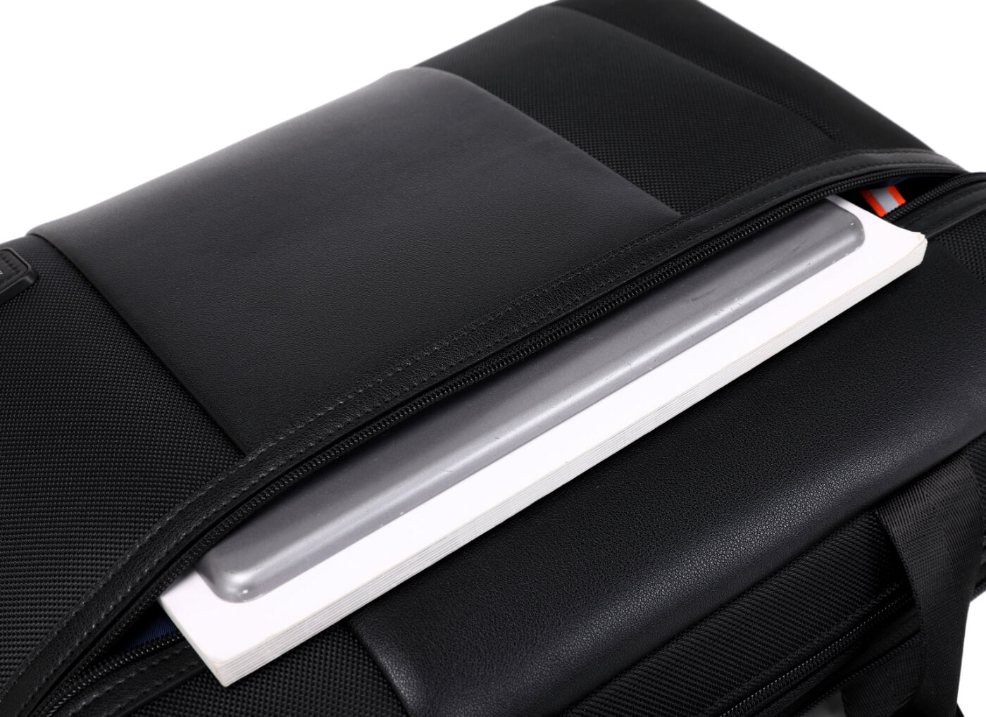 Vous pouvez ouvrir à 180 degrés la grande poche située à l'arrière du sac à dos, qui contient entre autres des compartiments pour les appareils électroniques tels qu'un ordinateur portable et une tablette. Ainsi, vous pouvez déplier confortablement toute la poche et vous repérer facilement dans tous les objets stockés.