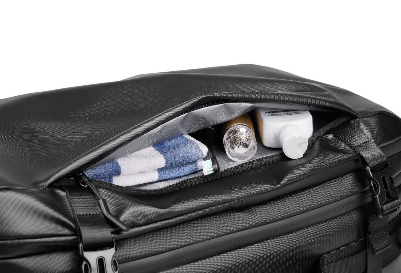 Rangez les cosmétiques et articles similaires dans la poche imperméable isolée située à l’avant du sac à dos. Cela empêchera l'humidité de pénétrer dans d'autres parties du sac à dos.