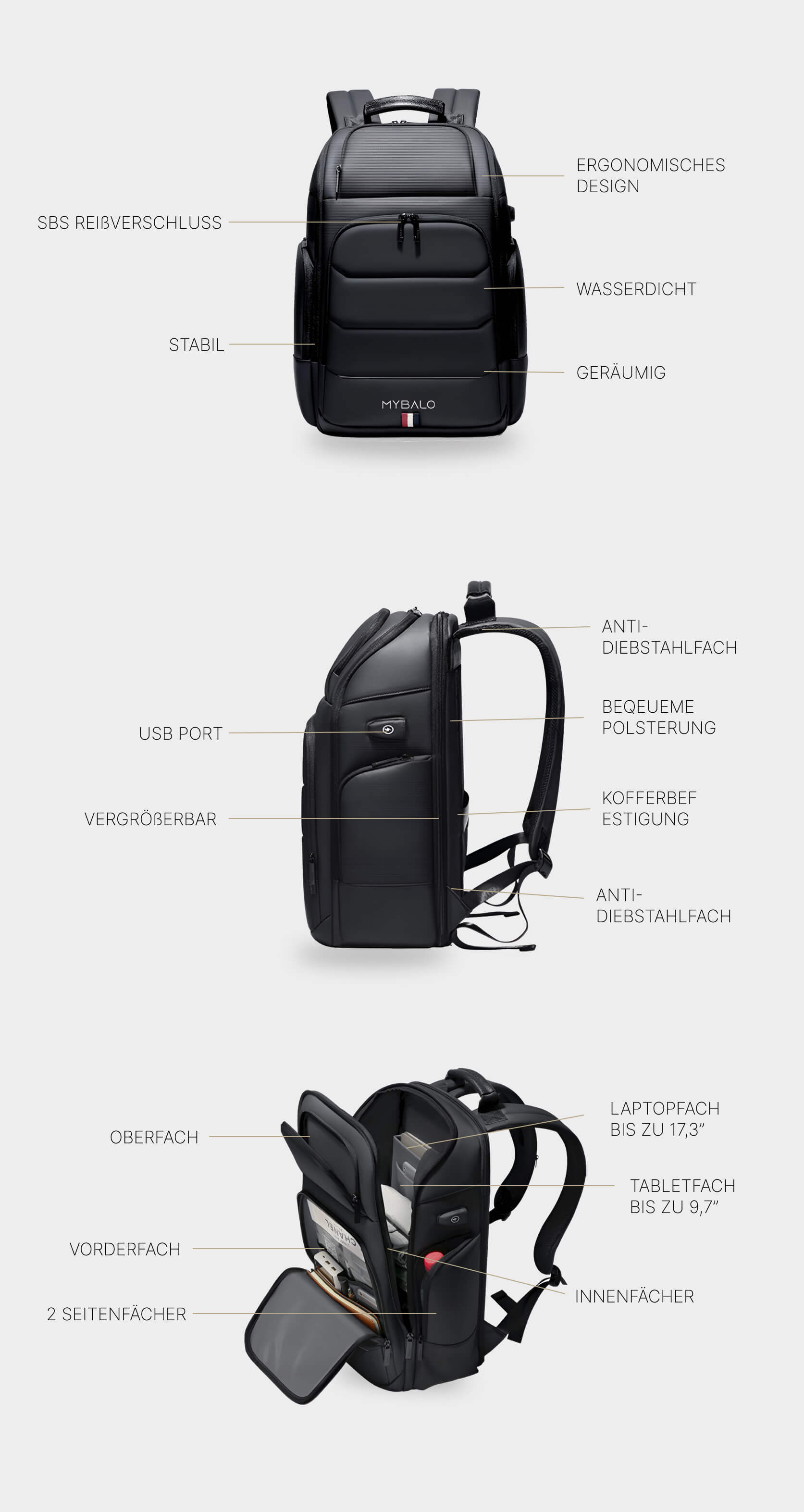 MYBALO Atlas bietet viel Platz für den Alltag und kürzere Ausflüge. Hier können Sie bequem Laptop, Tablet, Dokumente, Skripte, Buch, Kopfhörer, Wasserflasche, Lunchbox und Dinge für den Nachmittagssport unterbringen. Auch kürzere Fahrten können Sie damit bewältigen.