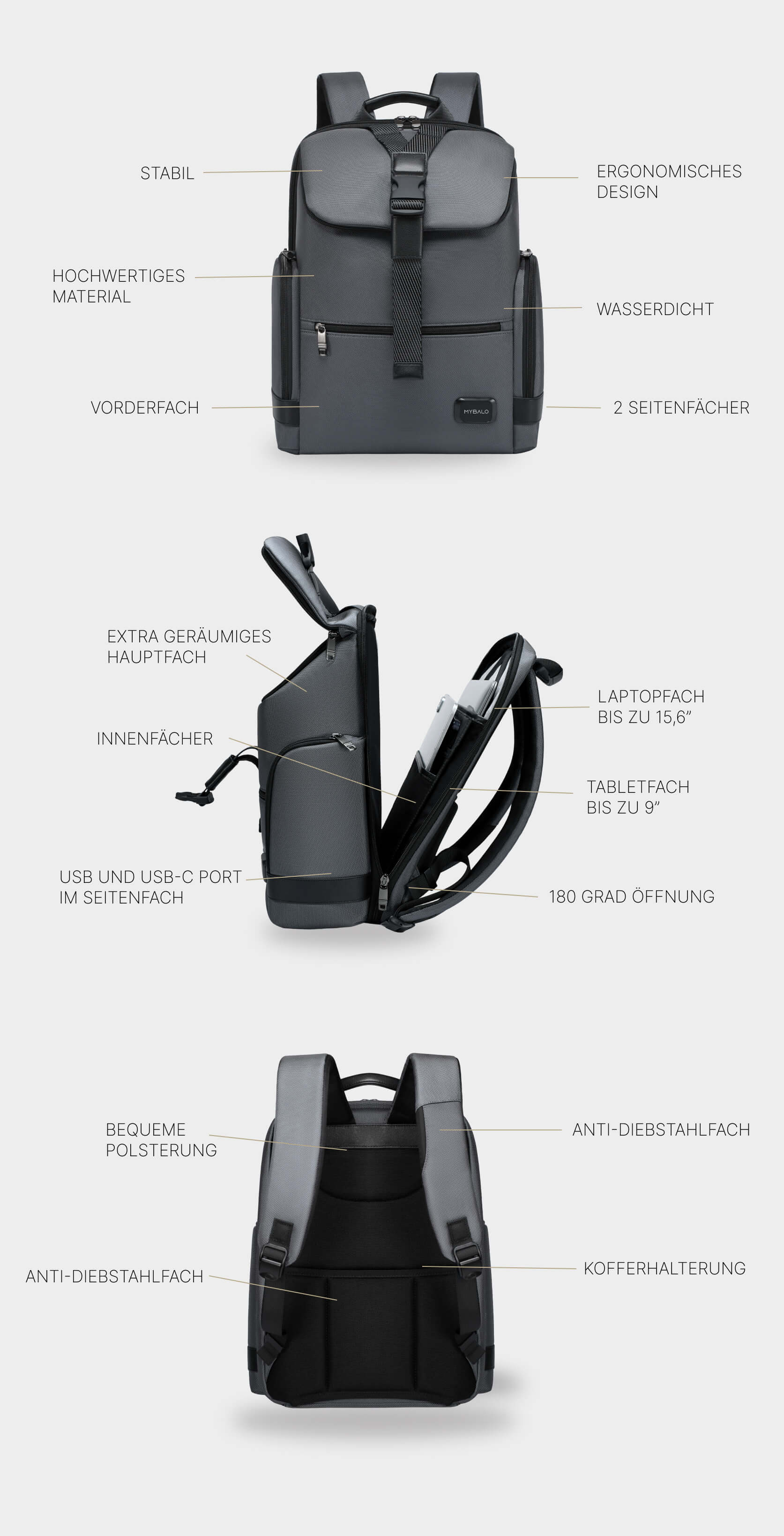 Dieser Rucksack verfügt über ein separates Fach für einen Laptop und ein Tablet, das sich in einer Tasche mit der Möglichkeit befindet, sich um bis zu 180 Grad zu öffnen, was eine wirklich gute Zugänglichkeit der verstauten Dinge garantiert. Freuen Sie sich außerdem auf einen integrierten USB-Anschluss zum Aufladen jederzeit und überall, zahlreiche praktische Innentaschen, eine Fronttasche, versteckte Taschen oder zwei Seitentaschen für Flasche, Regenschirm und andere Dinge. Egal, ob Sie zur Arbeit, zu einem Meeting, zu einem Workshop oder zu einem Ausflug aus der Stadt fahren, MYBALO BANGI ist für Sie da.