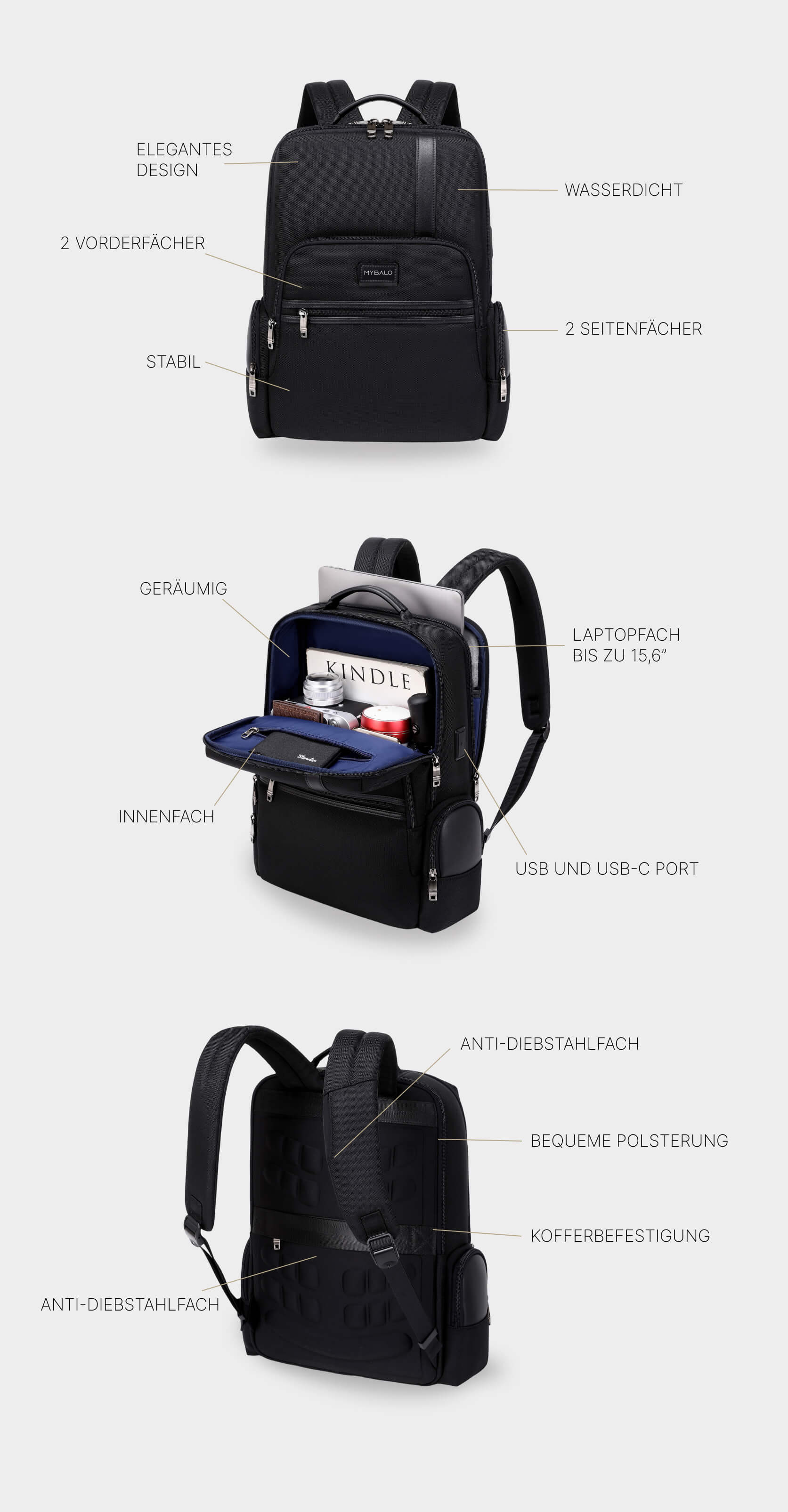 Für den Alltag in der Stadt, im Büro und in der Freizeit. Mit unserem MYBALO Bern kann man nichts falsch machen und er wird in jeder Situation ein toller Begleiter sein. Er bietet ausreichend Platz, sodass Sie darin bequem alles verstauen können, was Sie für den ganzen Tag benötigen. Dieser Rucksack verfügt über ein separates Fach für einen Laptop, das sich in einer Tasche mit der Möglichkeit befindet, sich um bis zu 180 Grad zu öffnen, was eine gute Zugänglichkeit garantiert von gespeicherten Dingen. Freuen Sie sich außerdem auf einen integrierten USB- und USB-C-Anschluss zum Aufladen Ihrer elektronischen Geräte jederzeit und überall, zahlreiche praktische Innentaschen, versteckte Taschen, zwei Fronttaschen und zwei Seitentaschen für Flasche, Regenschirm und andere Dinge . Ob auf dem Weg zur Arbeit, zu einem Meeting, einem Workshop oder einem Ausflug aus der Stadt, MYBALO Bern ist für Sie da.