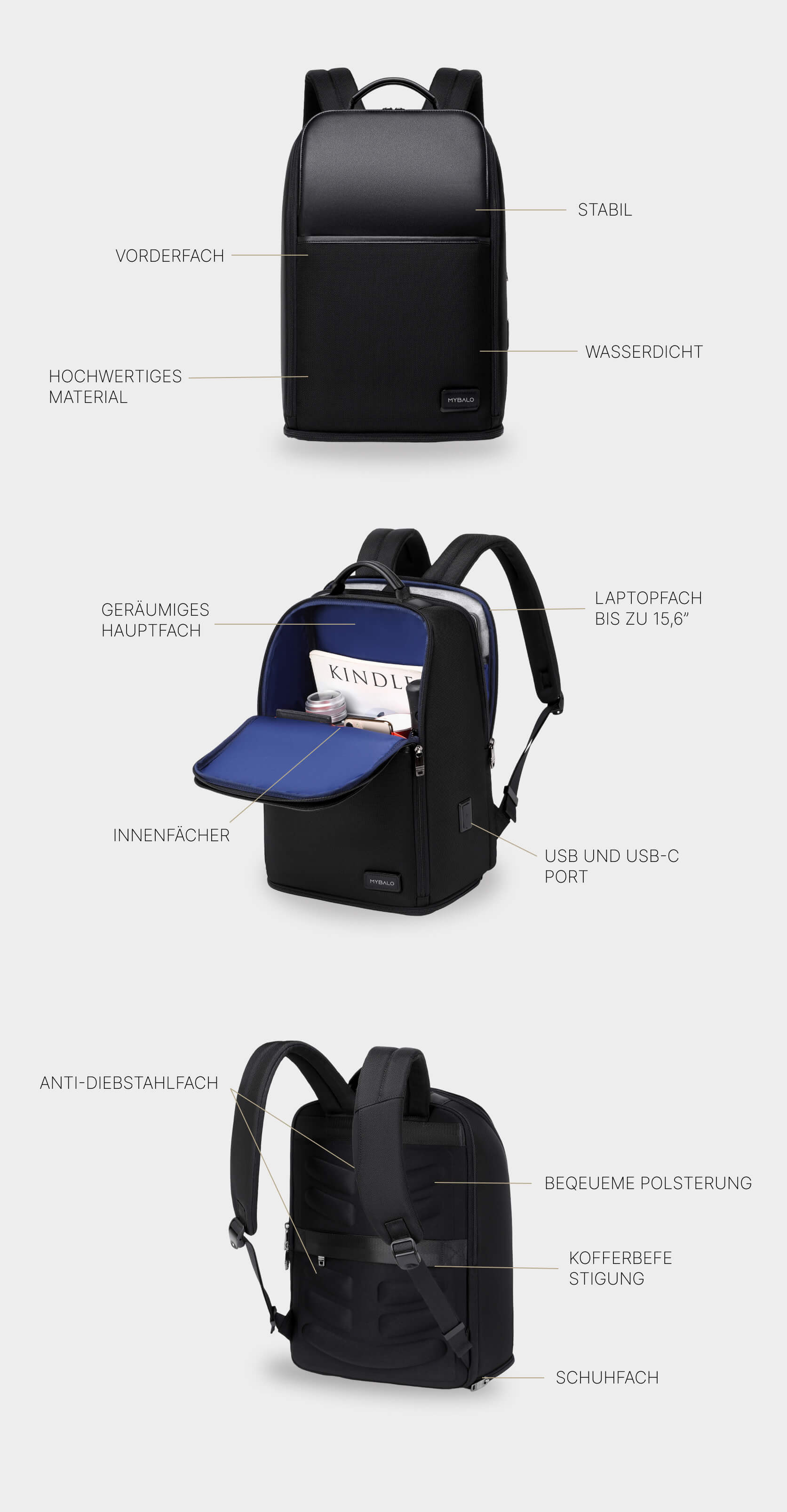 Rucksäcke für den täglichen Gebrauch ab einem Volumen von ca. 25 l können auch für kürzere Reisen, beispielsweise Wochenendausflüge, verwendet werden, es hängt jedoch stark von Ihrem Bedarf an Stauraum ab. Der MYBALO Bristol verfügt über ein sehr geräumiges Hauptfach, in dem Sie mehrere Dinge übereinander schichten können, was bei optimaler Raumausnutzung auf Reisen von Vorteil sein kann. Darüber hinaus verfügt er über eine integrierte Tasche, die von der Unterseite des Rucksacks aus zugänglich ist. Benutzen Sie es zum Beispiel für Ersatzschuhe, einen Regenschirm oder eine leichte Jacke.