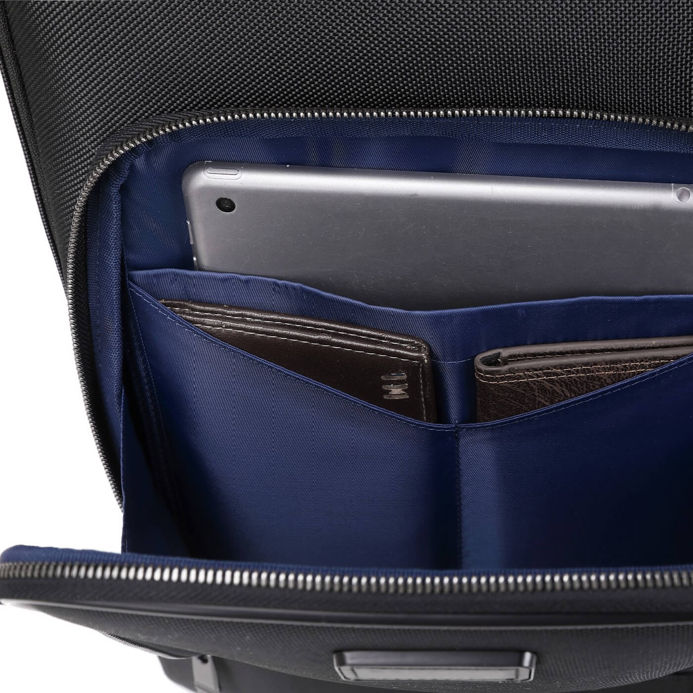Die große Tasche auf der Rückseite des Rucksacks lässt sich um 180 Grad öffnen und enthält unter anderem Fächer für elektronische Geräte wie Laptop und Tablet. So können Sie die gesamte Tasche bequem aufklappen und sich in allen verstauten Dingen leicht zurechtfinden.