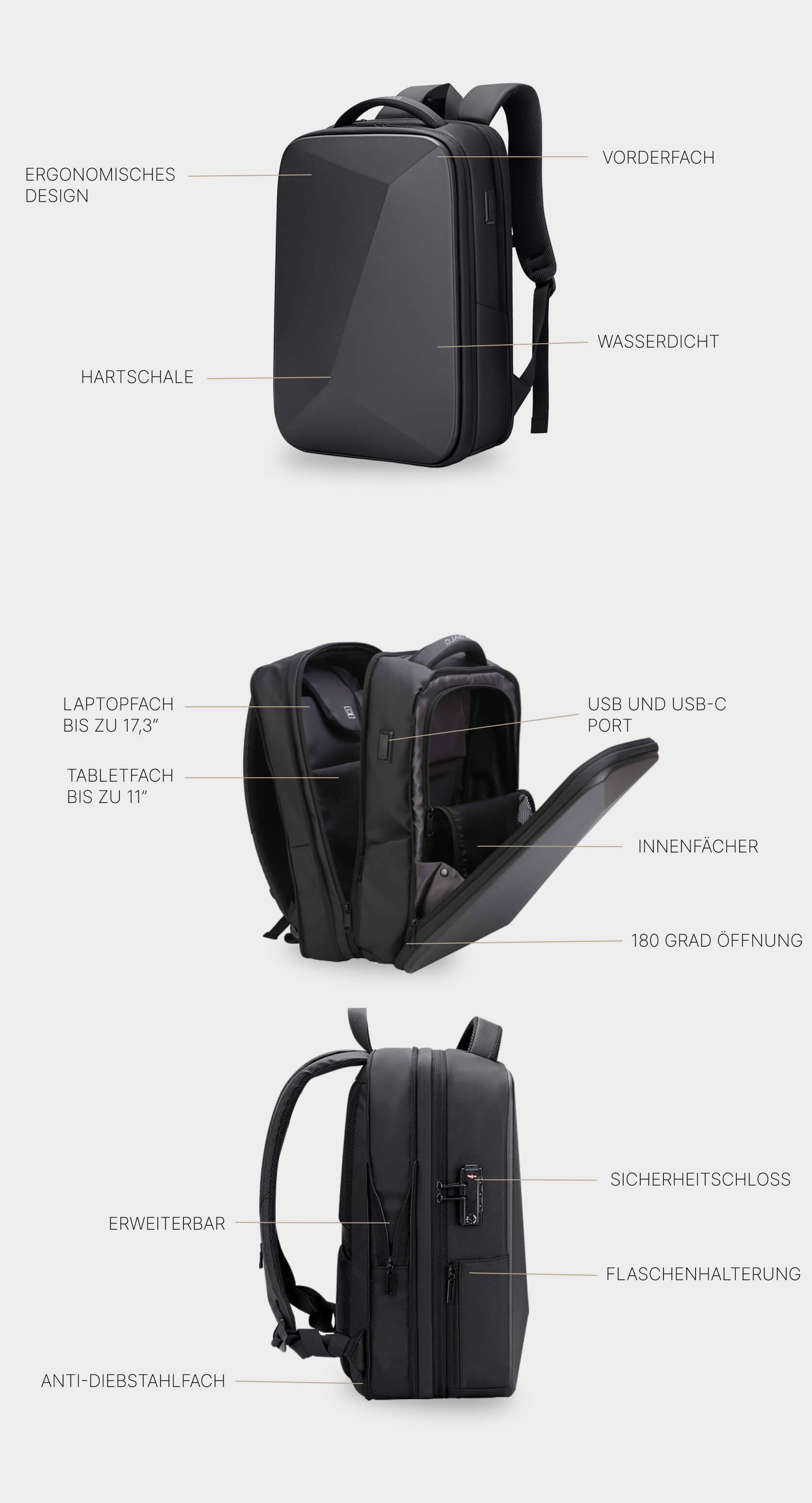 Die gesamte Vorderseite des Rucksacks besteht aus einer Hartschale. In jedem Fall besteht keine Gefahr, dass ein Dieb den Rucksack durchtrennt .