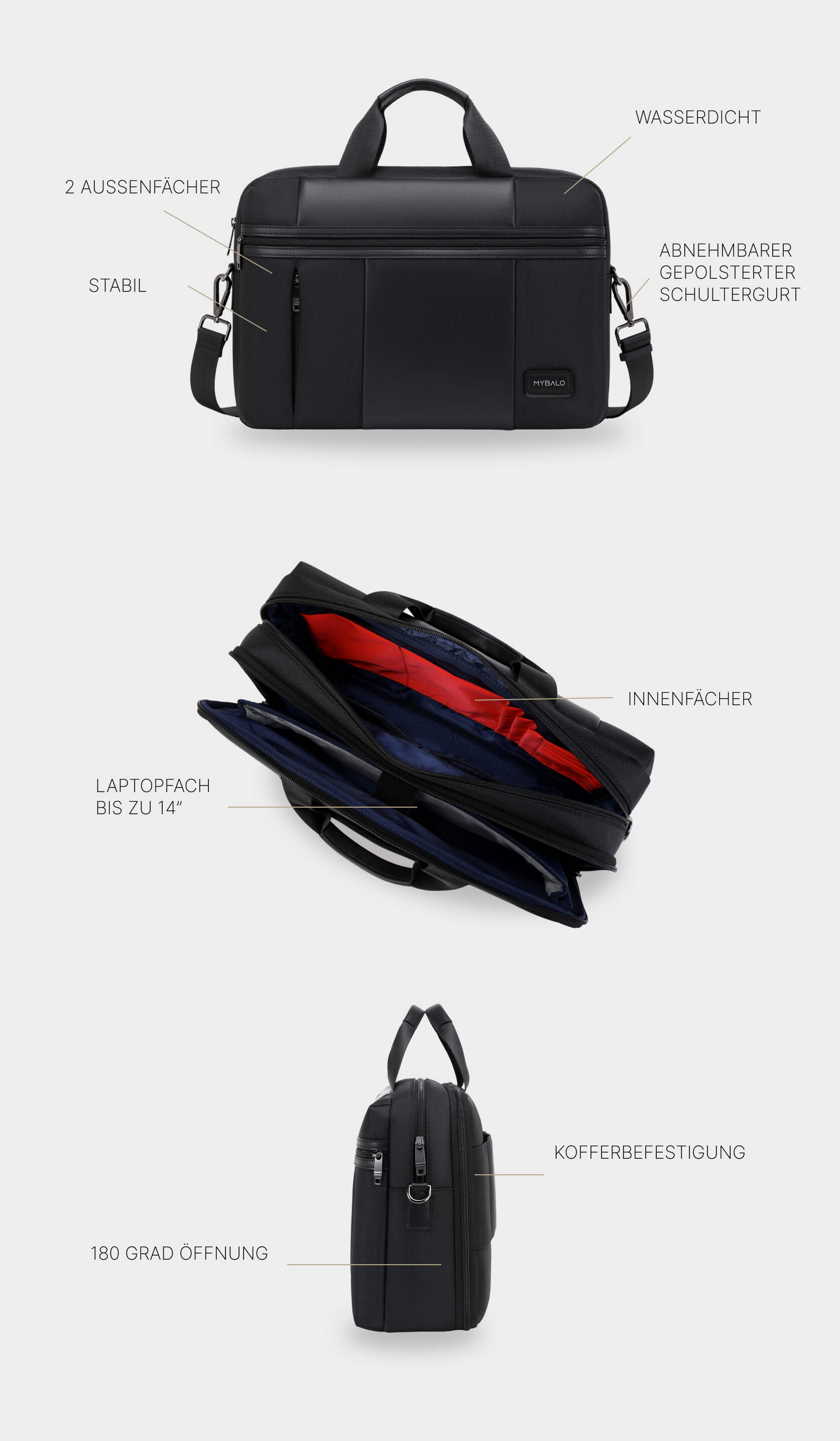 In der Tasche finden Sie eine praktische große Tasche mit der Möglichkeit, sie bis zu 180 Grad zu öffnen, in der sich ein separates Fach für einen Laptop befindet. Auf diese Weise haben Sie Ihre elektronischen Geräte wirklich leicht zugänglich. Die praktische Organisation der Dinge wird durch die Front- und Innentaschen mit farbigem Futter ermöglicht, dank derer Sie sich auch bei eingeschränkter Sicht leicht zurechtfinden. Ein weiteres Feature ist ein eingenähter Riemen zur Befestigung der Tasche am Koffergriff auf Reisen. Die elegante Laptoptasche MYBALO Lugano ist eine tolle Wahl für jeden Arbeitstag.