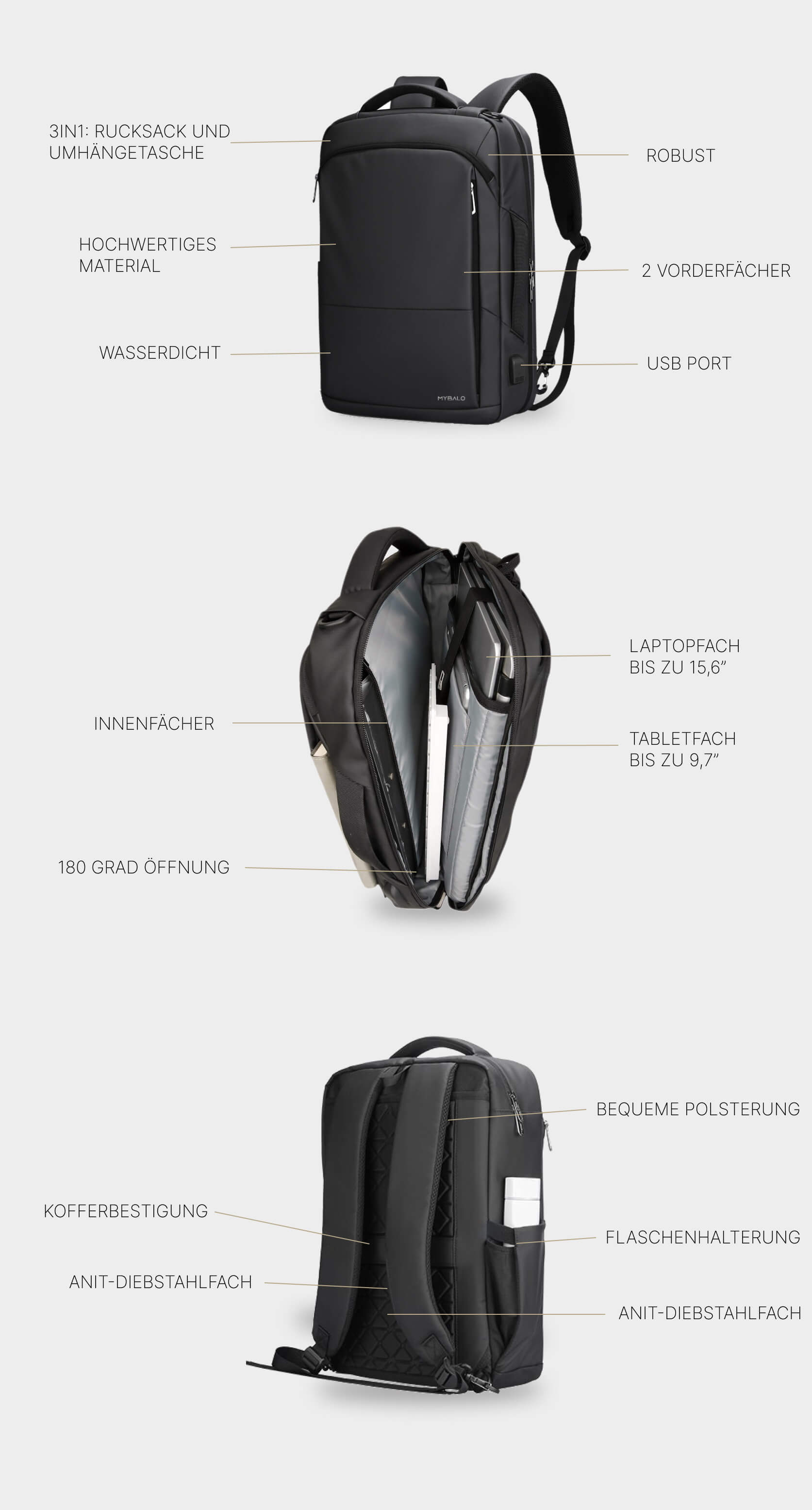 - 3 in 1: Rucksack, Umhängetasche, Handtasche