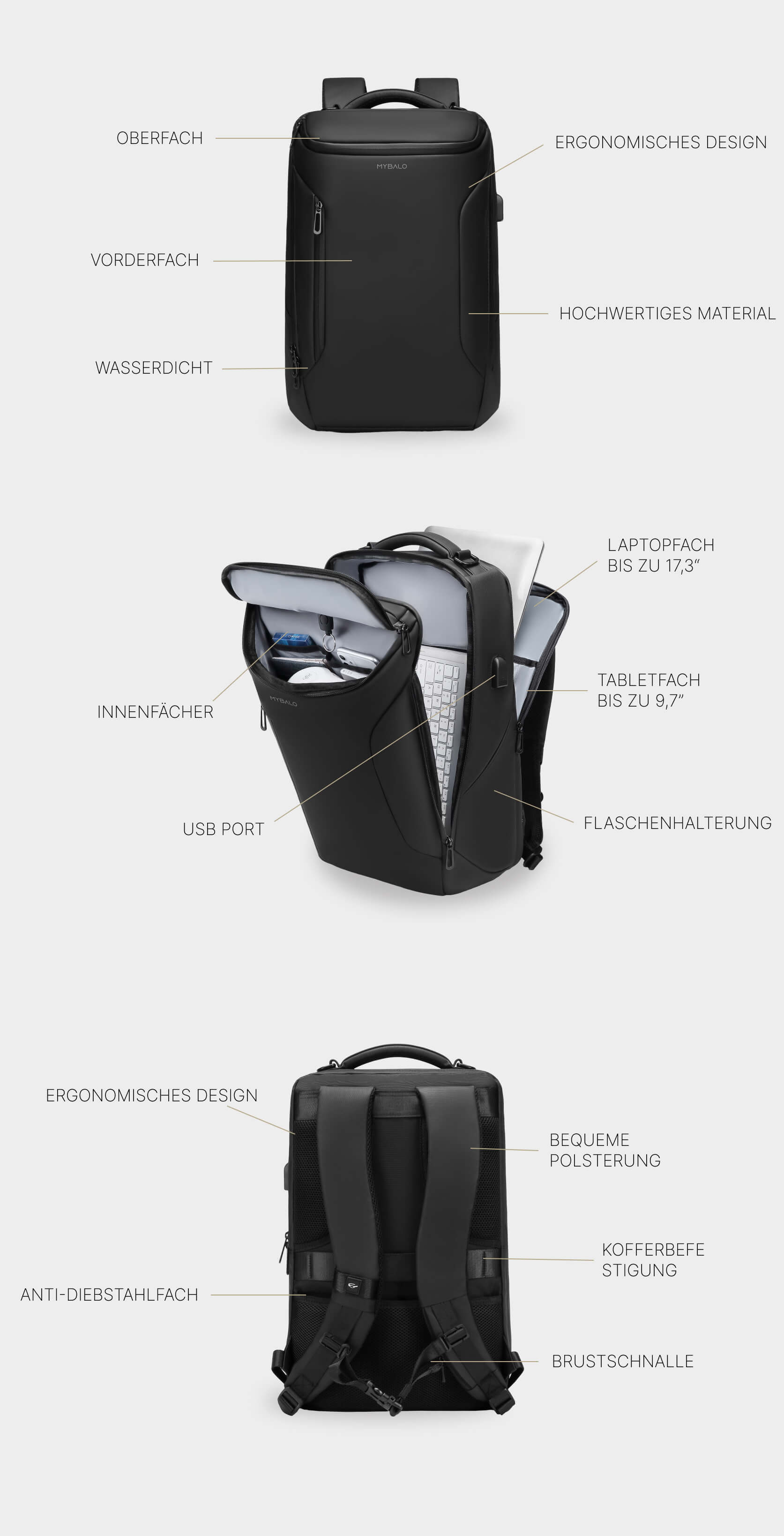 Ausgestattet ist der Rucksack mit einem separaten und hervorragend zugänglichen Fach für Laptop und Tablet, einem USB-Anschluss zum Aufladen jederzeit und überall, mehreren praktischen Innentaschen zum Organisieren von Dingen, einer Flaschentasche und anderen Gadgets. Egal, ob Sie zur Arbeit, zu einem Meeting, zu einem Workshop oder zu einem Ausflug aus der Stadt fahren, MYBALO Metropolitan ist für Sie da.