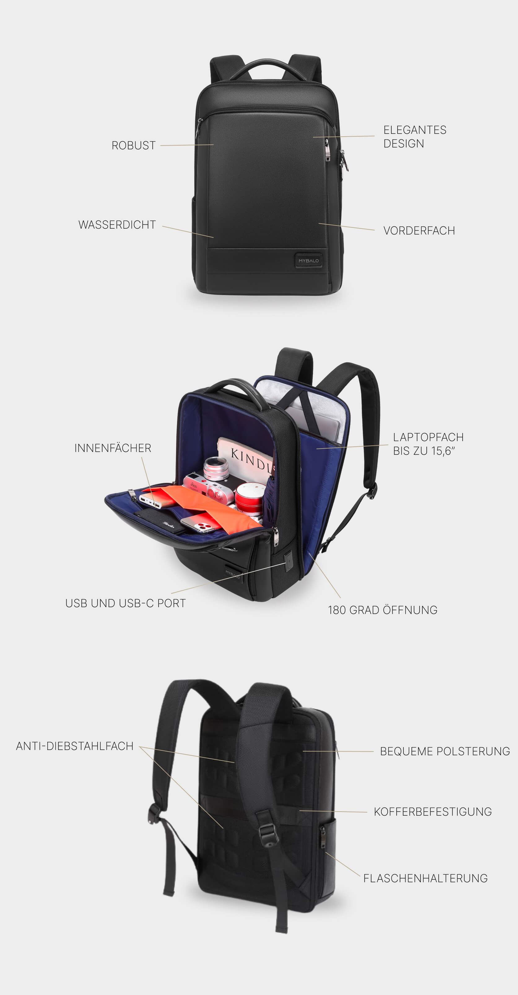 Die große Tasche auf der Rückseite des Rucksacks lässt sich um 180 Grad öffnen und enthält unter anderem Fächer für elektronische Geräte wie Laptop und Tablet. So können Sie die gesamte Tasche bequem aufklappen und sich in allen verstauten Dingen leicht zurechtfinden.