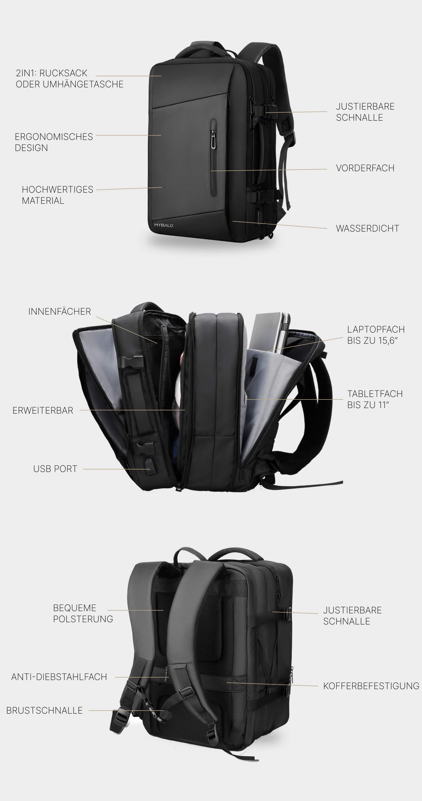 Wir stellen Ihnen drei Möglichkeiten vor, den MYBALO Zürich Rucksack zu tragen. Tragen Sie es als klassischen Rucksack, als Handtasche oder, nach Anbringen des gepolsterten Riemens, als Umhängetasche.